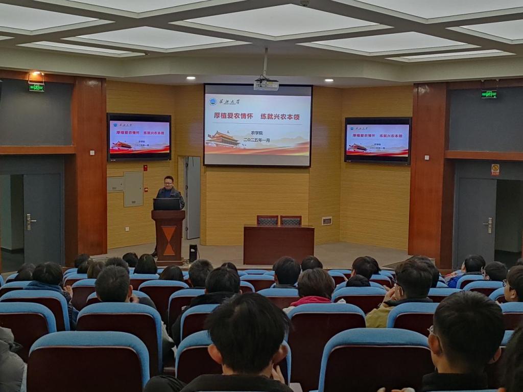 (通讯员 李佳怡)2025年1月2日晚六点半,betway西汉姆联于农科大楼1056报告厅举行一场面向2024级本科生的学农爱农宣讲报告会,旨在激发员工学农爱农的热情,为农业发展培育新生力量。betway西汉姆联副经理张运波、副书记尹小华及2024级全体本科生出席本次报告会,会议由尹小华主持。