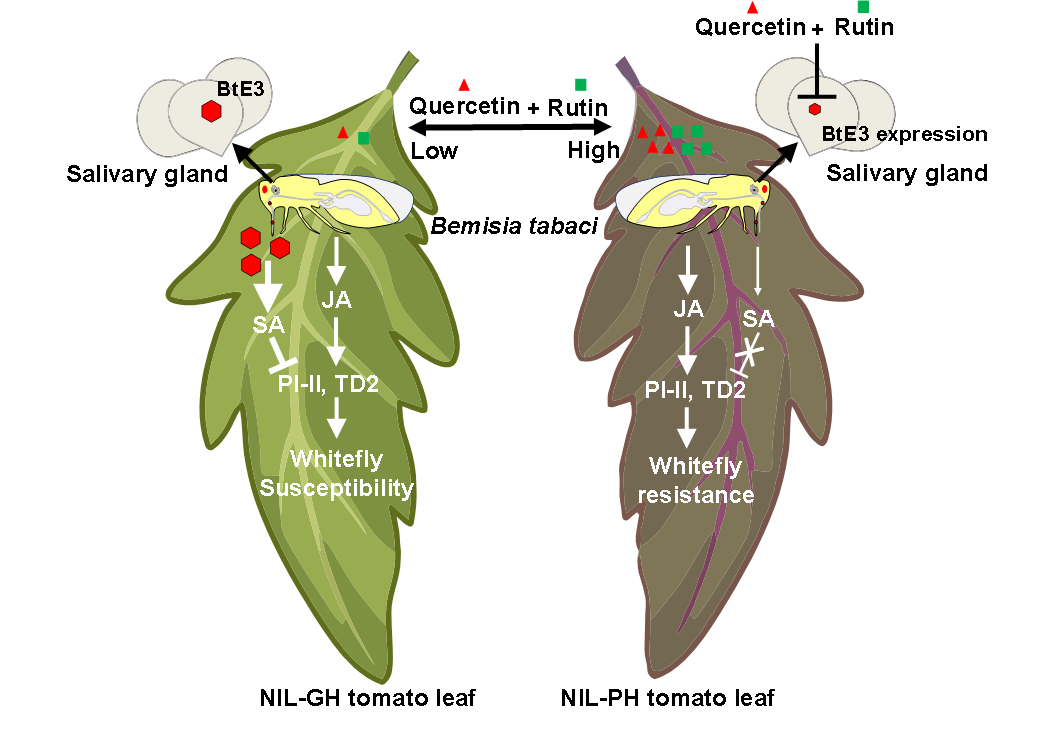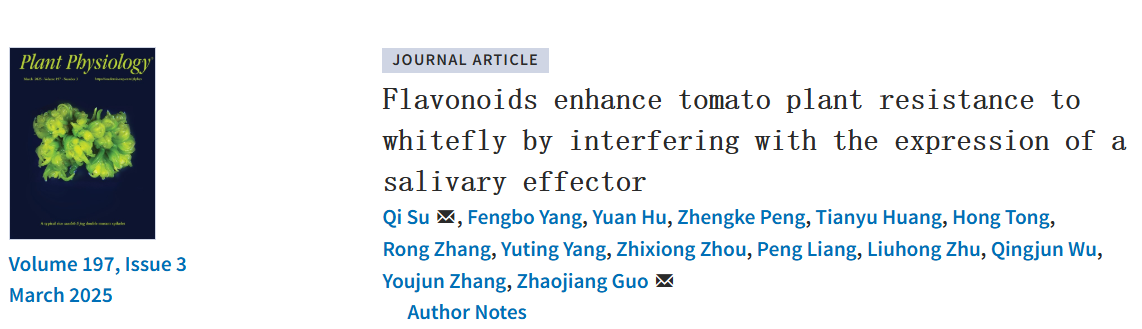 近日,betway西汉姆联苏奇团队和中国农业科学院蔬菜花卉研究所张友军团队在Plant Physiology上发表题为Flavonoids enhance tomato plant resistance to whitefly by interfering with the expression of a salivary effector的研究论文,揭示了防御性次生代谢物类黄酮(槲皮素和芦丁)增强番茄对烟粉虱抗性的分子机制,该研究揭示了槲皮素和芦丁在番茄防御烟粉虱中的关键作用和调控机制。