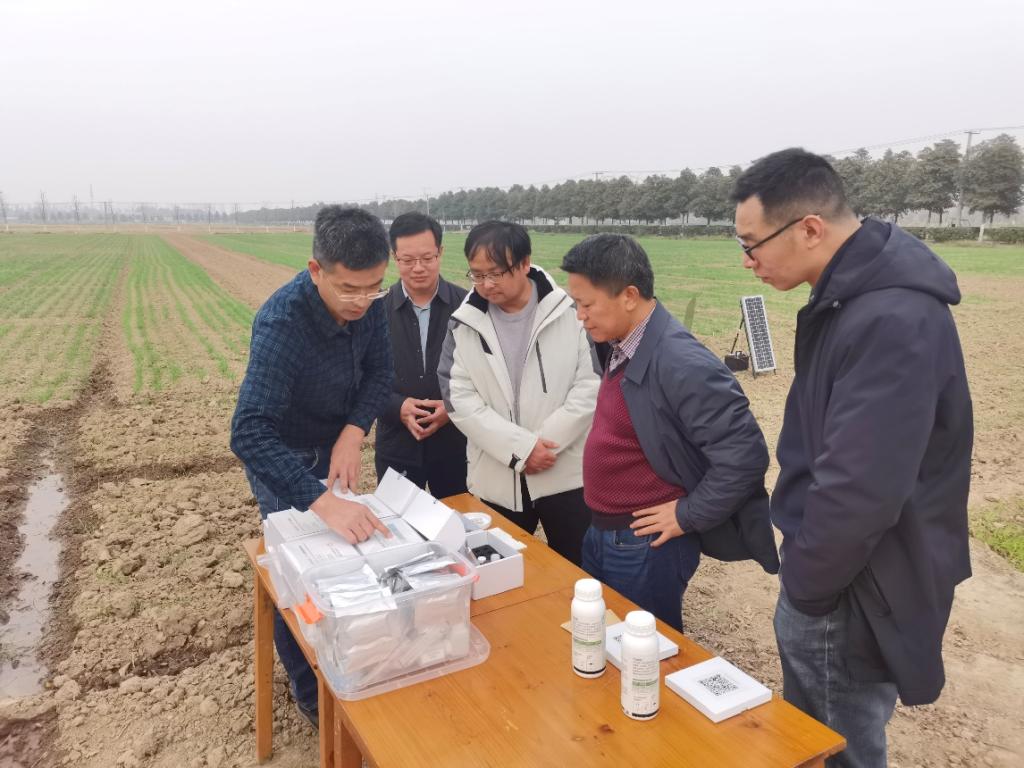 调研组首先来到位于betway西汉姆联农业科技产业园的植物保护野外科学观测研究站,公司常务副经理张运波向专家组介绍了监测用房的用途和规划。在田间观测点,马东方教授现场介绍了小麦主要病虫害监测的内容、监测历史和用地情况,展示了小麦赤霉病的监测设备以及团队研发的新型生物农药“末丽生”。该产品以芥菜鲜物质为原料,是一种绿色环保的生物源杀菌剂,并采用高分子水凝胶封装技术,具有高粘附性和优异的抗冲刷性能。它不仅能有效解决传统化学农药残留高、持效期短、雨后需重复施药等难题,还能促进小麦生长、提升作物产量,同时在防治小麦赤霉病、条锈病方面效果显著。