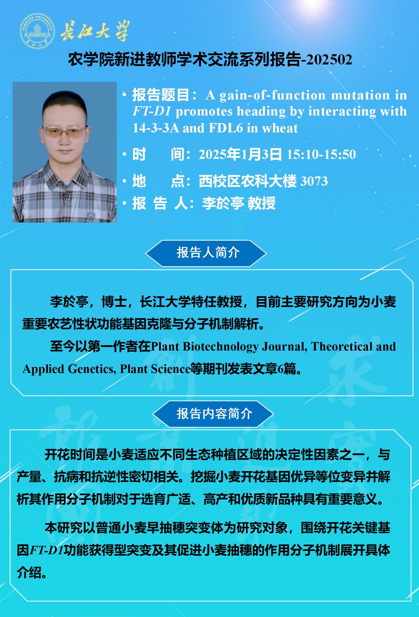 betway西汉姆联2025年学术报告(二):A gain-of-function mutation in FT-D1 promotes heading by interacting with 14-3-3A and FDL6 in wheat