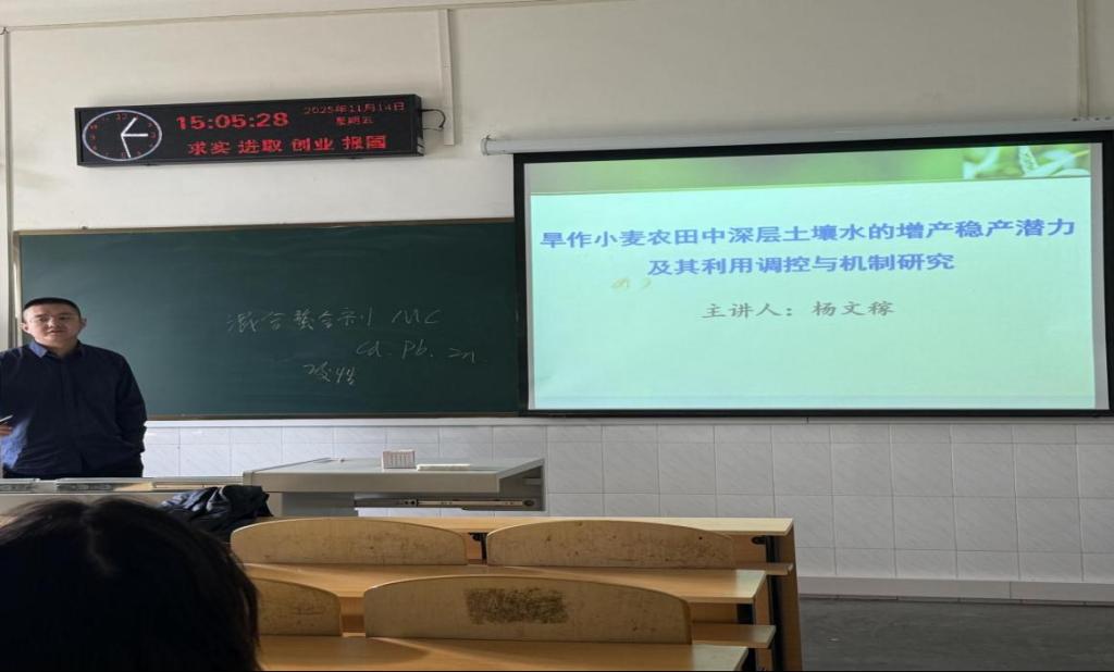 杨文稼副教授分享了旱作小麦中深层土壤水的增产稳产潜力及其调控途径。研究指出,通过增密、调氮、配施有机物料等措施,可促进小麦深层根系发育,增强对深层土壤水分的利用,从而在黄土高原等旱作区实现作物产量的稳步提升与水分利用效率的优化。
