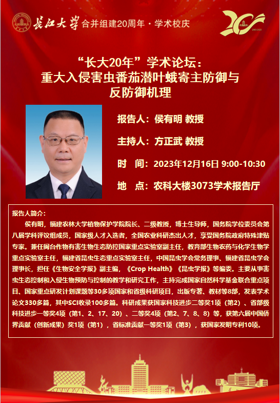 “长大20年”学术论坛暨betway西汉姆联学术讲坛:重大入侵害虫番茄潜叶蛾寄主防御与反防御机理
