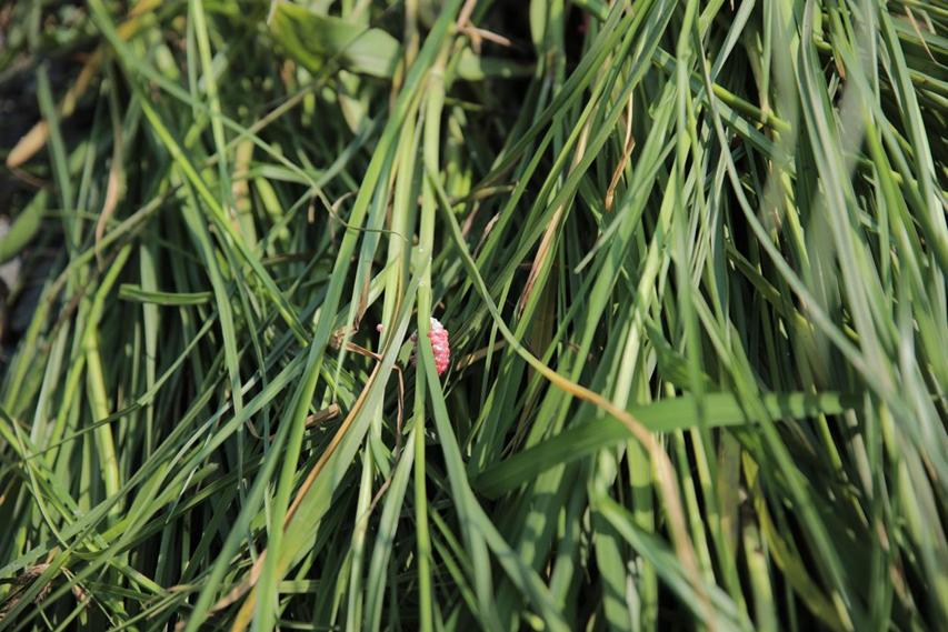 在热火朝天的拔草过程中,一位细心的男同学发现了稗草茎秆上的粉红色物体:“老师,你们看这是什么?粉红色的,一串串的。”