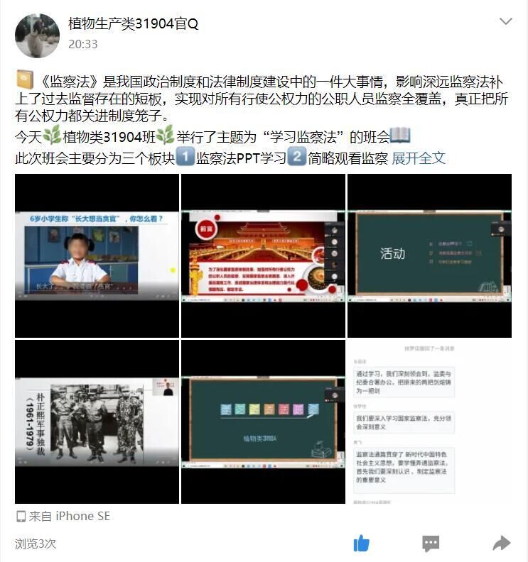 植物类31904班通过ppt及视频资料进行了学习,通过法学院杨春磊老师的精彩讲述,同学们进一步认识了监察法的深远意义,明白了监察法的未来意义。学习委员最后讲到老员工是,是社会的主要建设者,学习监察法,争做廉洁人,是我们每个老员工共同的承诺。