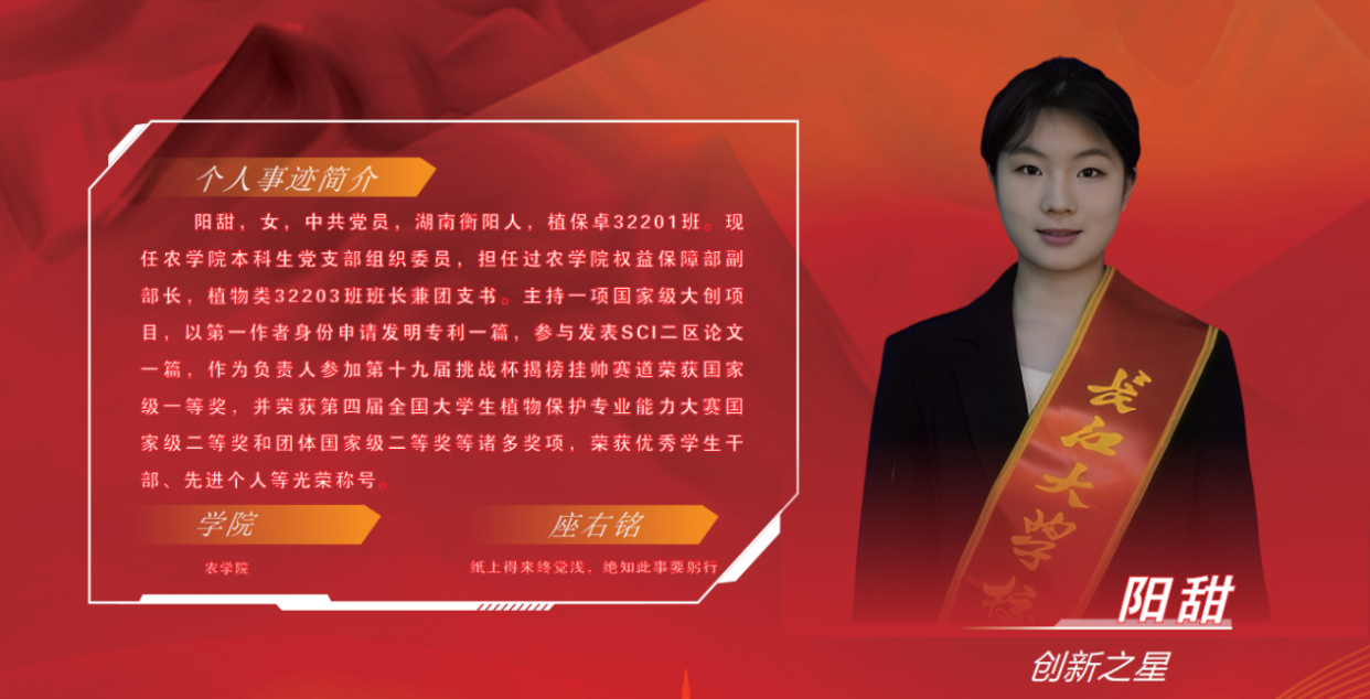 “实验室的显微镜能看到细胞结构,田间地头的汗水能照见乡村振兴的未来。”从学术殿堂到乡土中国,阳甜以创新为犁,深耕农业科技;以奉献为种,播撒青春热忱。未来,她将继续以坚定的步伐,在成长的道路上书写更多可能。