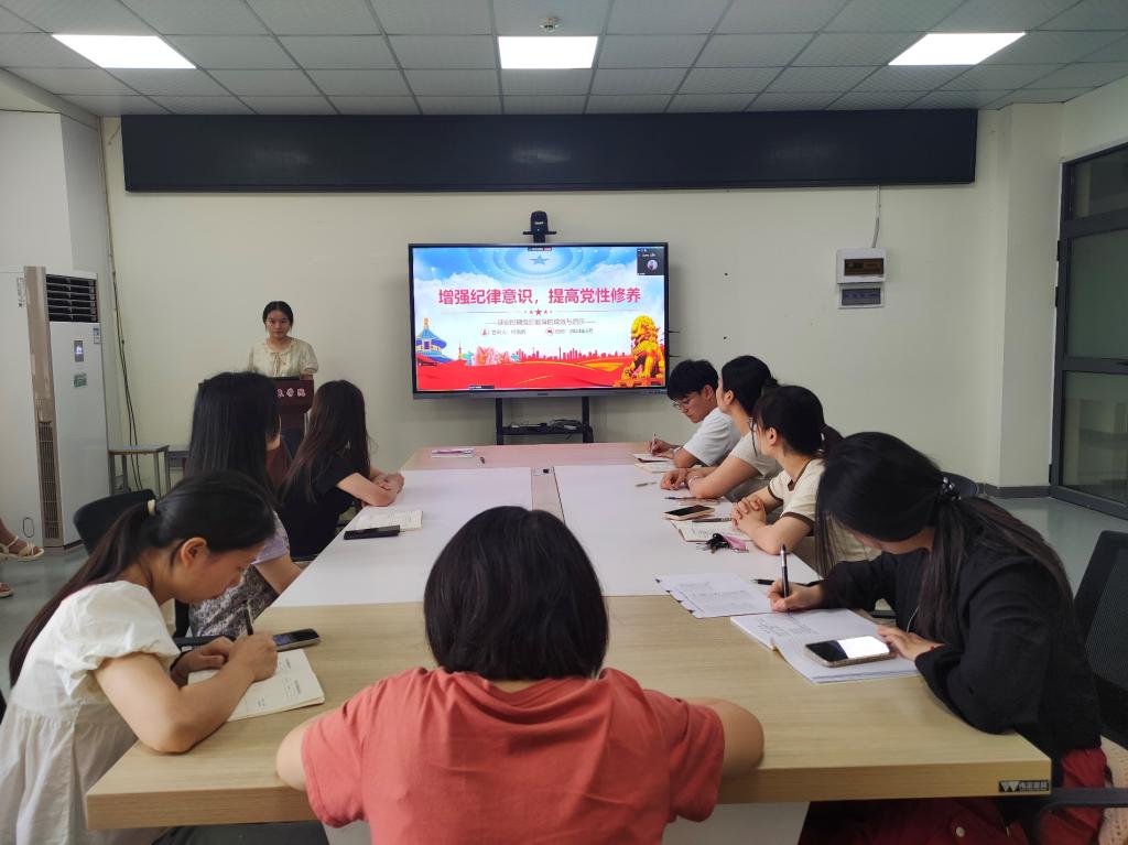 会议伊始,全体党员重温入党誓词,王思婷同志对本月党费交纳情况进行说明,全体党员诵读《中国共产党章程<修正案>》第三章相关内容。随后进入党课(微党课)与集体学习党的创新理论环节,支部书记付雪娇同志讲授党课《增强纪律意识,提高党性修养》,李欣芸同志带领党课学习《“当代愚公”——黄大发》;李凌同志带领学习《习近平总书记关于党的纪律建设的重要论述》《习近平总书记在山东考察时强调以进一步全面深化改革为动力 奋力谱写中国式现代化山东篇章》,魏展鹏同志带领学习《习近平总书记对档案工作作出重要指示批示》《全省领导干部警示教育会举行》,麻朝兰同志带领学习《学校召开领导干部警示教育会》《一图读懂<湖北省科学技术进步条例>》。