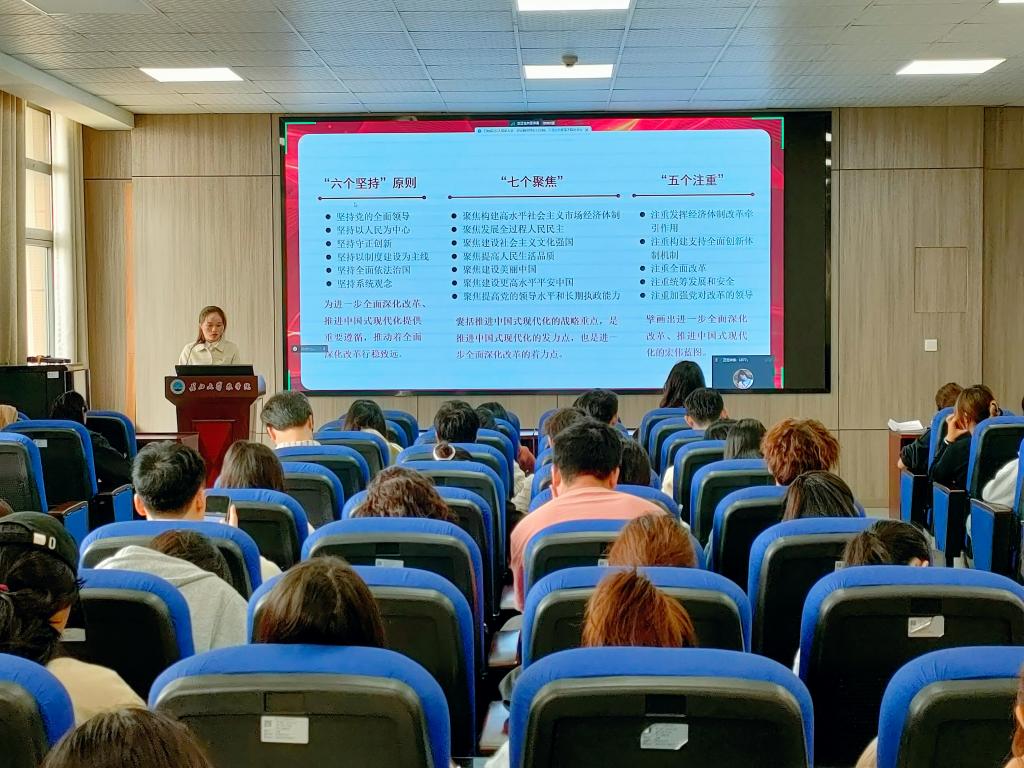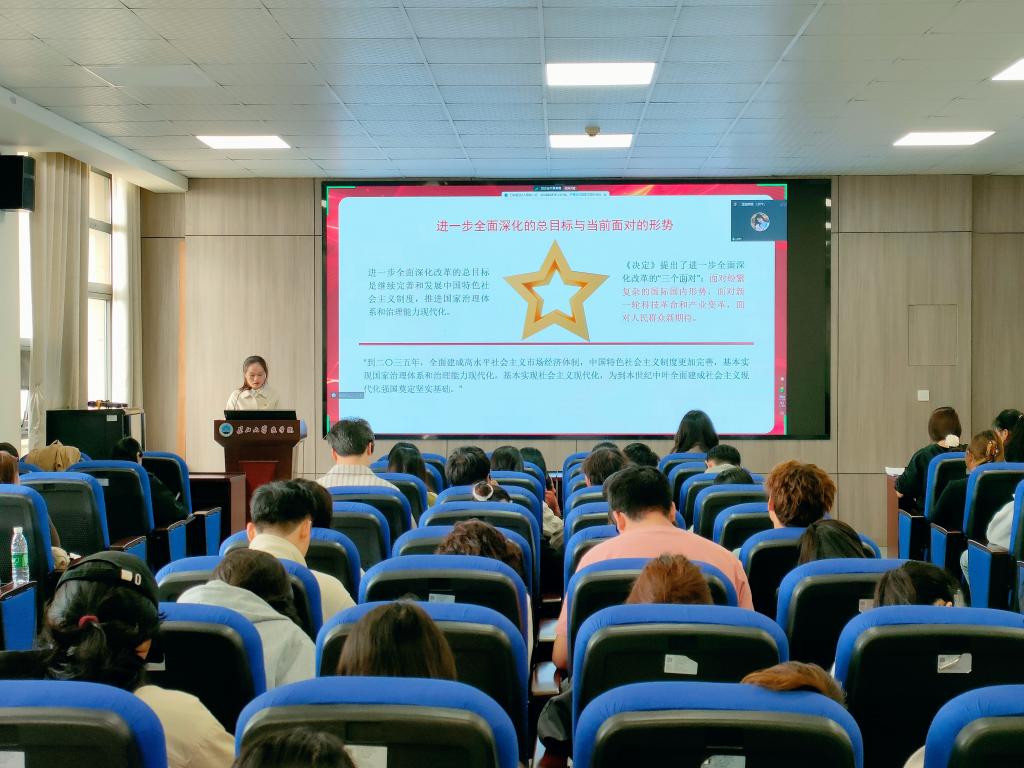 在会上,付老师系统解读了党的二十届三中全会的重要论述,引导广大党员深刻认识党的性质宗旨、指导思想和奋斗目标,切实把思想和行动统一到党中央决策部署上来。付老师强调,学习成果的内化和外化是党员干部的必然要求,思想与行动的统一体现了党员干部的自觉性和主动性,是推进各项事业发展的重要保证。付老师指出,将学习成果转化为实际成效,是党员干部履行职责、服务群众的具体体现,党员干部应当坚定理想信念,切实将学习成果转化为强大动力,以实际行动推动各项事业不断前进。付老师还深入剖析了新时代高校思政工作的新要求,强调广大党员要发挥先锋模范作用,不断提高政治站位和政治觉悟,为学院改革发展贡献自己的力量。