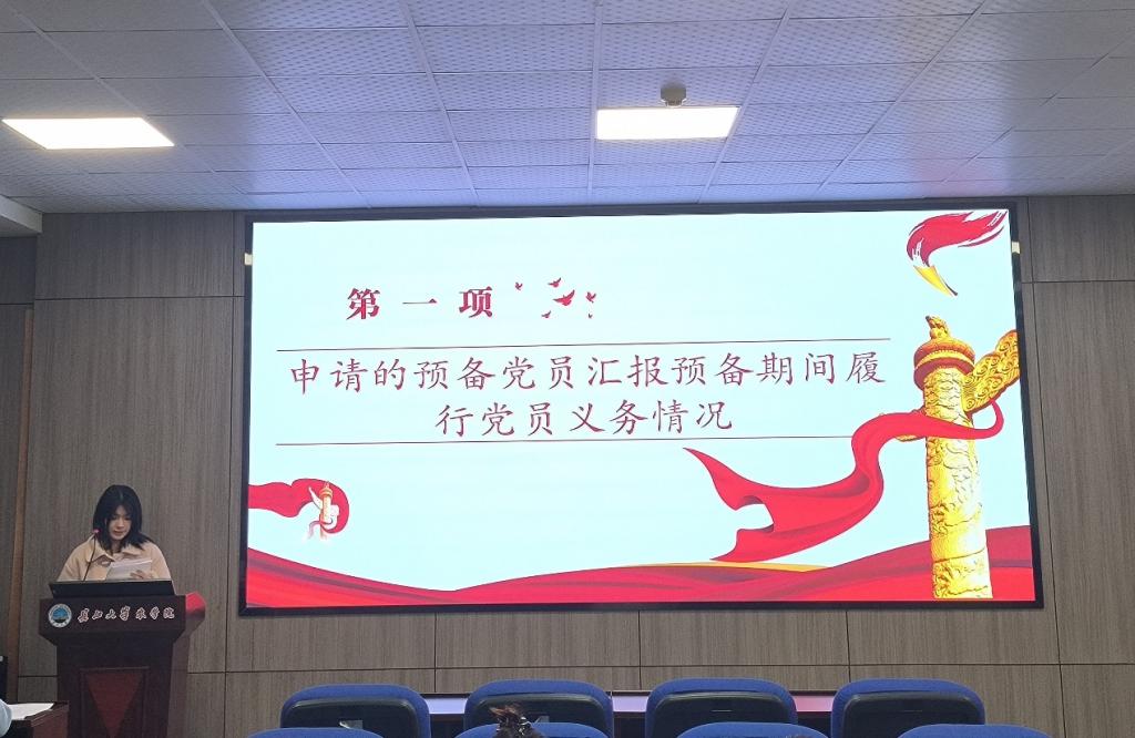 会议按照预备党员转正的组织程序进行。第一项由王思宇等5名申请转正的预备党员依次宣读转正申请,汇报在预备期间的学习、工作和生活情况,以及自己的思想认识和进步情况;第二项,由与会党员结合5名预备党员一年来的表现,对预备党员进行客观评价,就是否同意其转正发表意见;第三项,经过与会7名正式党员不记名投票表决,最终通过王思宇等5名预备党员的转正申请。