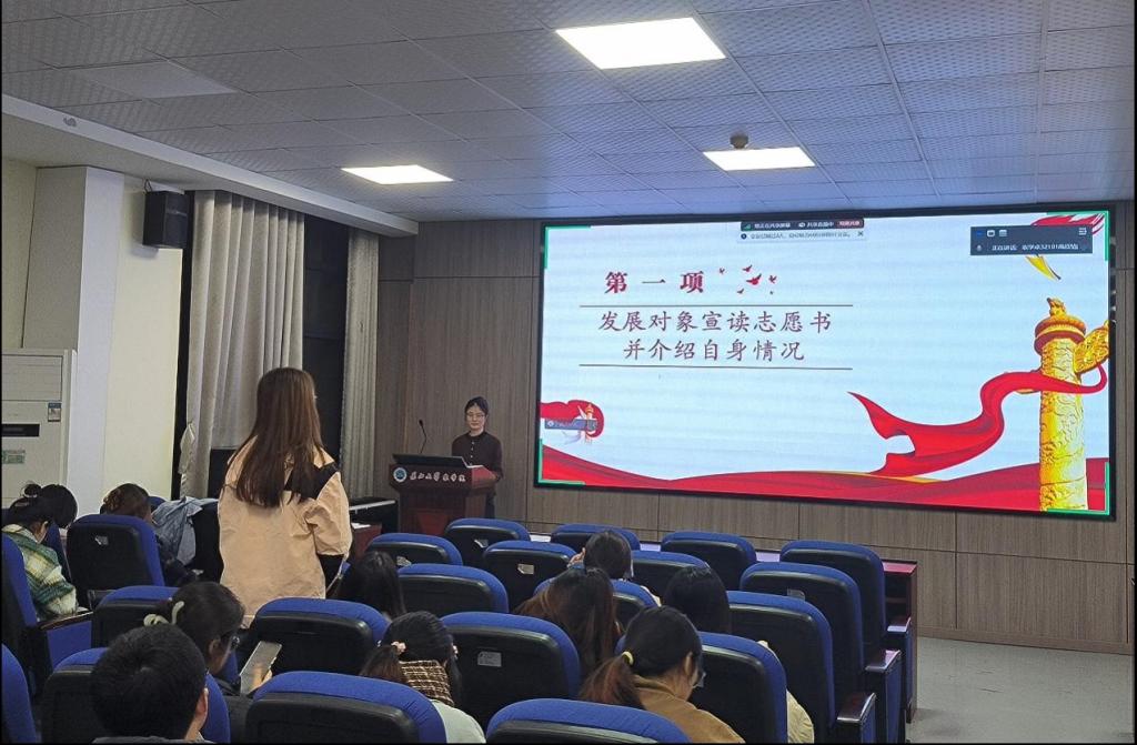 会议按照接收预备党员的组织程序进行。第一项,由张旭阳等9名发展对象依次宣读《入党志愿书》,并从思想、学习、工作、生活、入党动机等多个方面向党组织汇报自身情况;第二项,入党介绍人介绍发展对象的培养考察情况并表明自己的意见和态度;第三项,与会正式党员以无记名投票的方式对这9位发展对象能否成为预备党员进行表决,共发放表决票7张,收回表决票7张。最终,同意接收张旭阳等9名发展对象为中共预备党员。新发展的预备党员授戴党徽后,在组织委员曾袁琳珺同志的带领下,面向党旗,庄严宣誓。