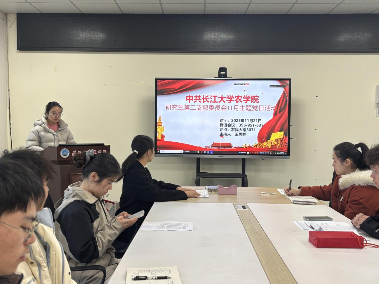 (通讯员 李嘉萍)11月21日,公司研究生第二党支部在农科大楼3071会议室开展11月份主题党日活动,活动结合腾讯会议(ID:396951637)的方式同时在线上召开。全体在公司党员和校外联培党员共同参与,活动由王思婷同志主持。