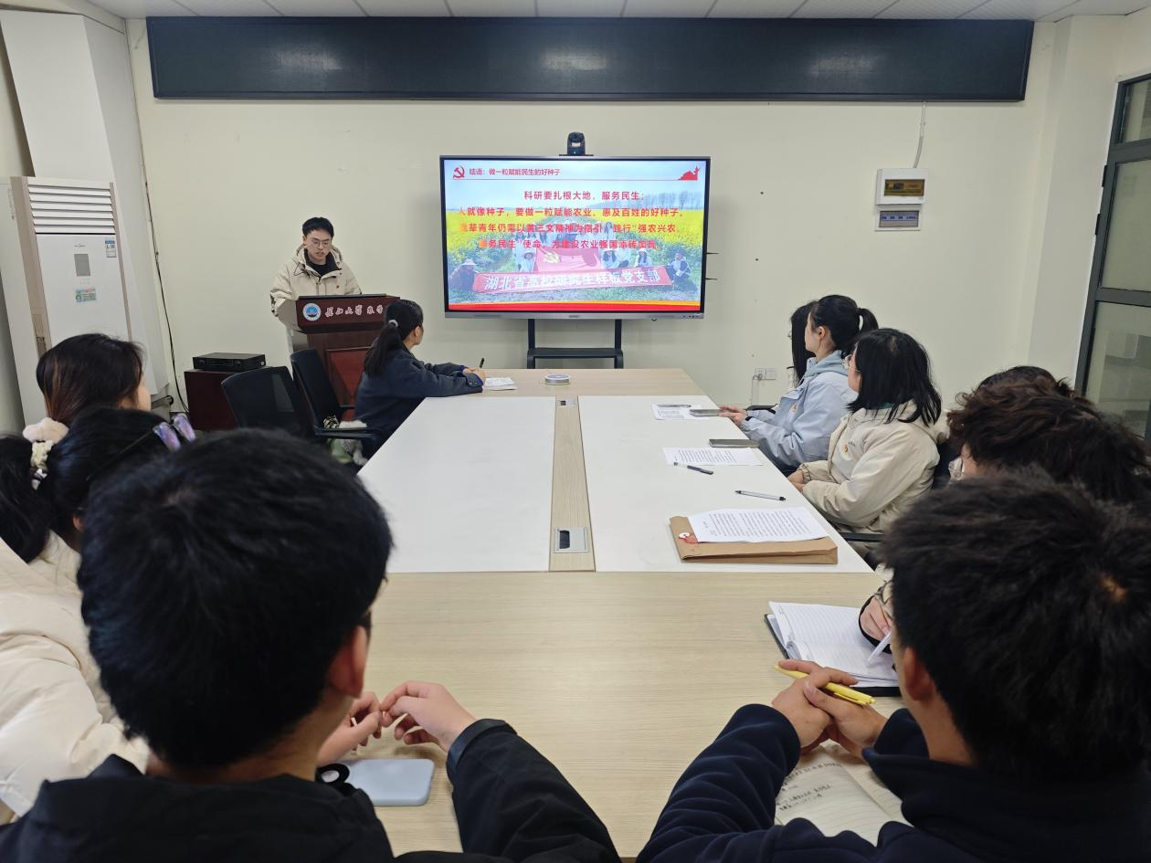 在交流研讨环节,与会党员以“深入学习贯彻党的二十届四中全会精神,结合《奋进“十五五”建功“双一流”——betway西汉姆联2026年新年献词》为主题展开讨论。王紫宜、帅亚婷、蔡露同志表示,将以长大精神为指引,立足专业研究,扎根基础领域、积极交流学习,深耕绿色防控病虫害研究,以专业本领为农业强国和母校“双一流”建设助力;将紧扣农业生产实际,完成毕业论文并凝练落地成果,秉持长大精神聚焦流域作物病害防控,为农业安全献力,为守护湖北粮食安全筑牢“隐形防线”。