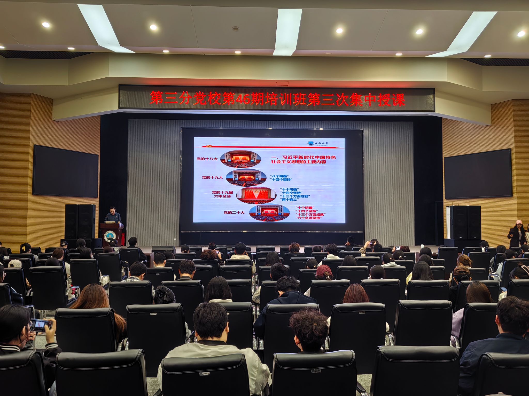 (通讯员 张源康/文 吴泓萱 胡雪晴/摄)为深入学习贯彻党的二十大精神,持续深化党史学习教育,筑牢青年学子思想根基,4月7日晚,第三分党校第 46 期培训班第三次集中授课在农科大楼1058报告厅顺利开展。本次培训聚焦学习贯彻习近平新时代中国特色社会主义思想主题教育,由公司党委书记周锦华主讲,学院辅导员唐玉婷及第三分党校全体入党积极分子、发展对象、预备党员共同参与。