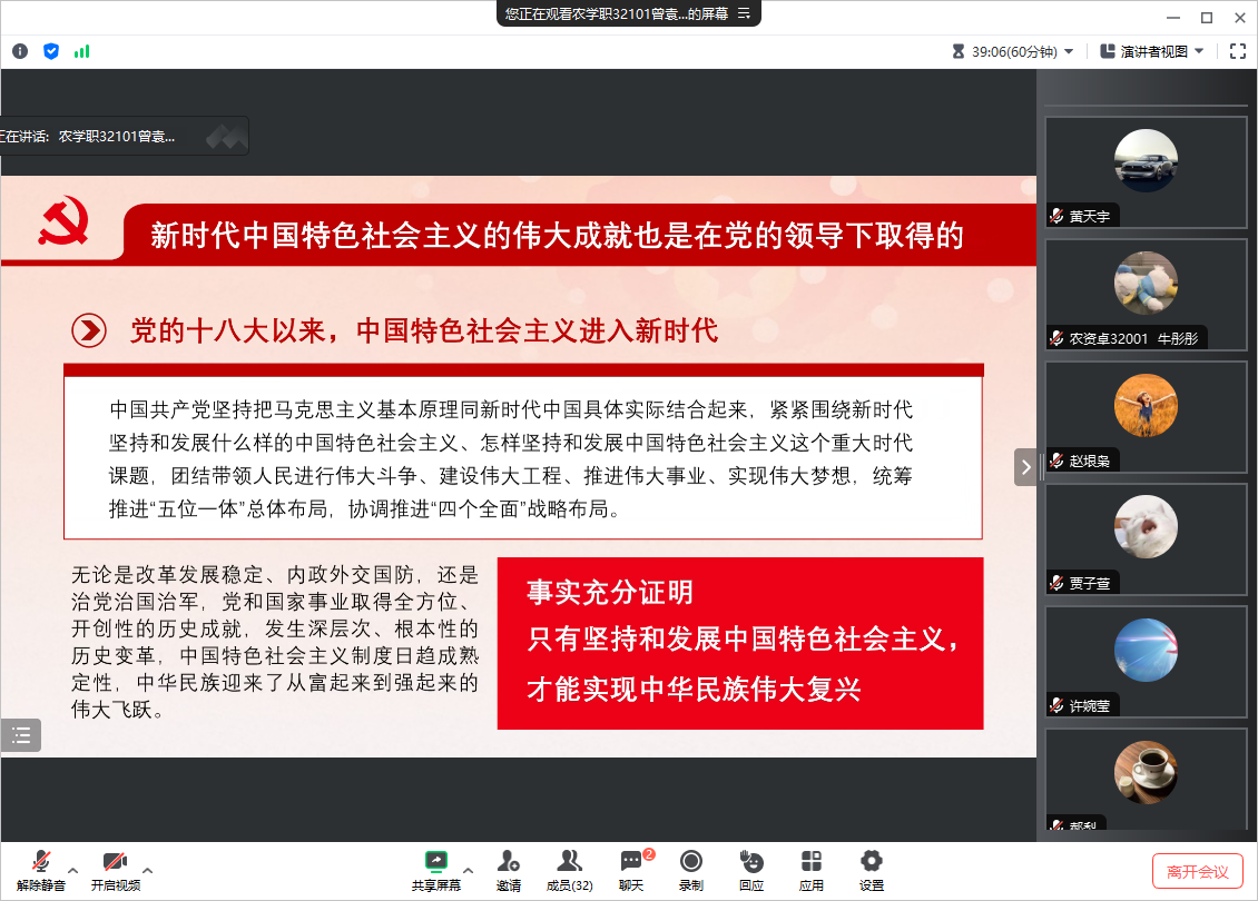 曾袁琳珺以坚持党的全面领导为题讲授微党课,一是中国共产党是中国式现代化和民族复兴呼唤新的政治力量;二是中国共产党应运而生实现了中国社会的深刻变革,三是中国共产党领导中国特色社会主义发展了中国,四是新时代中国特色社会主义的伟大成就是在中国共产党的领导下取得的。
