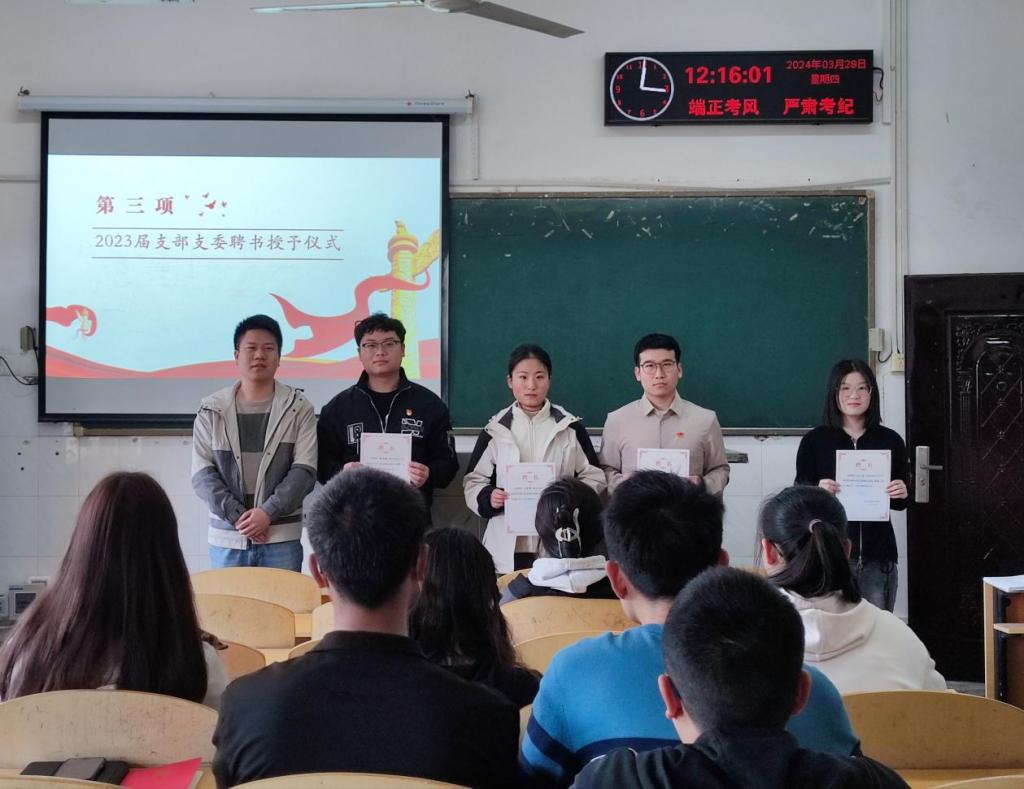 会议伊始,组织委员曾袁琳珺同志带领全体党员重温入党誓词;江雪同志对本月党费交纳情况进行了说明。接着,黄承石老师对上学年的工作作出总结,对姜月兴、习小杰、牛彤彤、徐志鹏4位2023届支部支委成员一年以来的辛勤工作表示高度的肯定和诚挚的感谢,并逐一为他们颁发聘书。