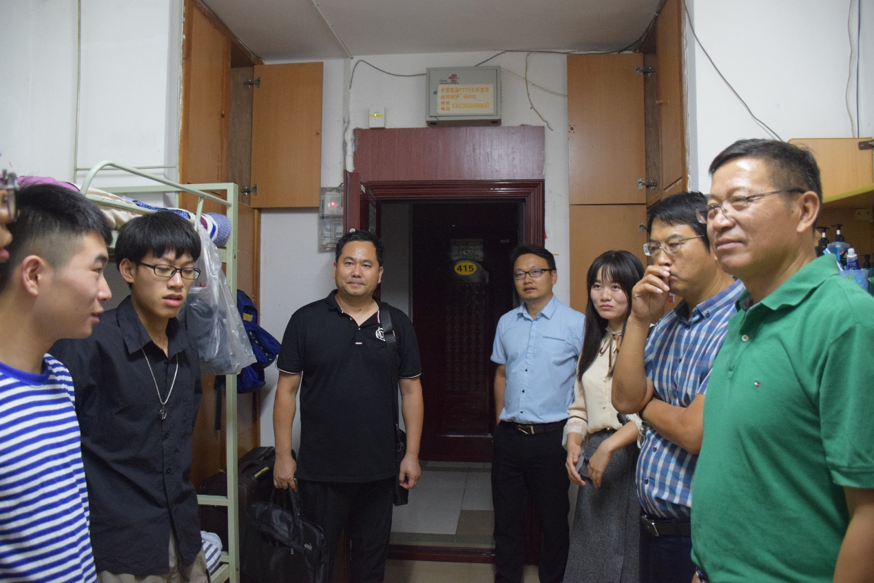 “适应荆州的气候和饮食吗?”“军训期间有没有出现不舒服的情况?”“一定要注意饮食卫生和人身安全呀!”在新生寝室内,老师与同学们亲切地交谈着,在一片欢声笑语中,主动询问大家的学习以及生活情况,并就提出的问题耐心解答。